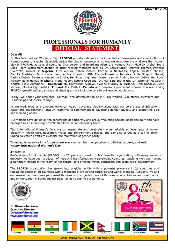 Professionals for Humanity (PROFOH) is 28 years non-profit, public benefits organization, with every sense of modesty, we have been a beacon of hope and transformation in developing countries, touching lives and making a significant impact in the realm of healthcare, safe drinking water, education, and sustainable development.